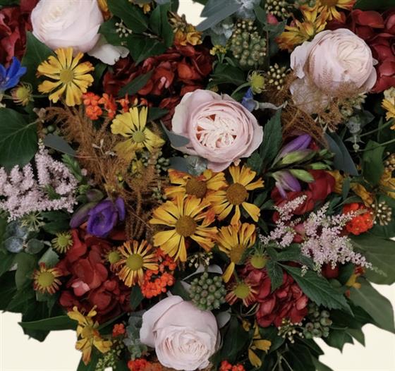 Combination of Autumn flowers such as Helenium, Freesia, Roses, hydrangea, and rustic foliage.