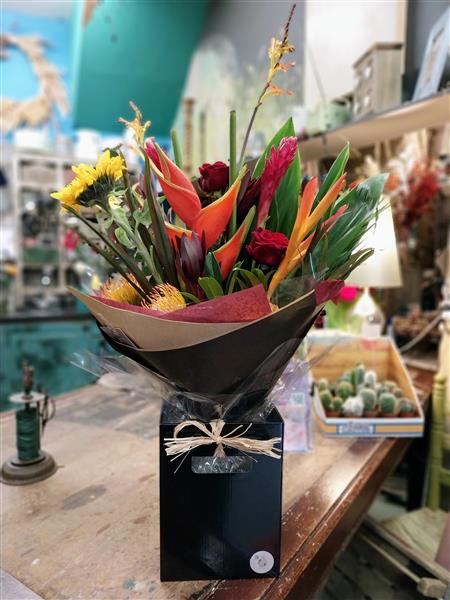 A vibrant combination of fresh lilies, anthuriums, heliconia, gladioli, pin-head protea, dracaena encased in palm leaves.